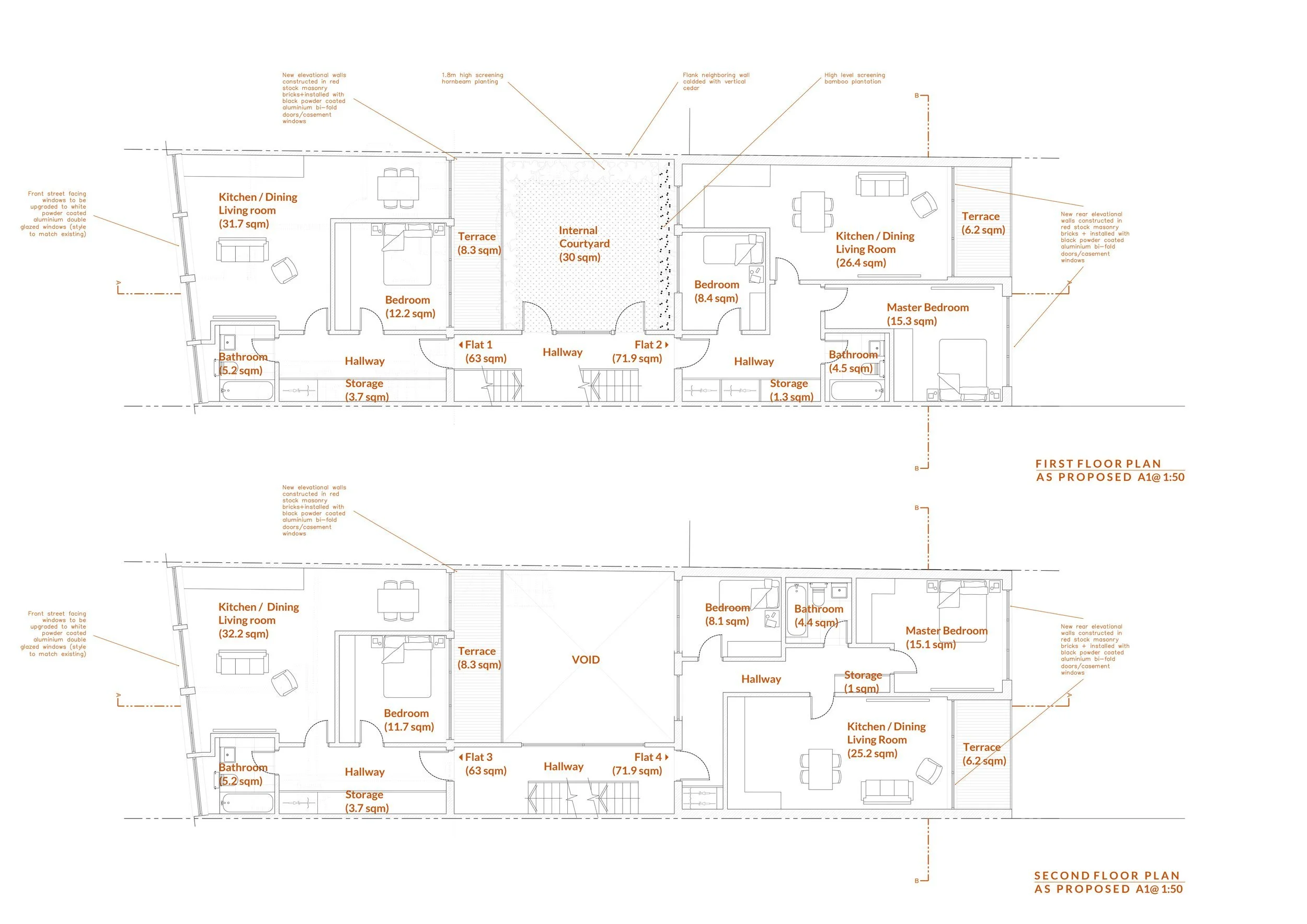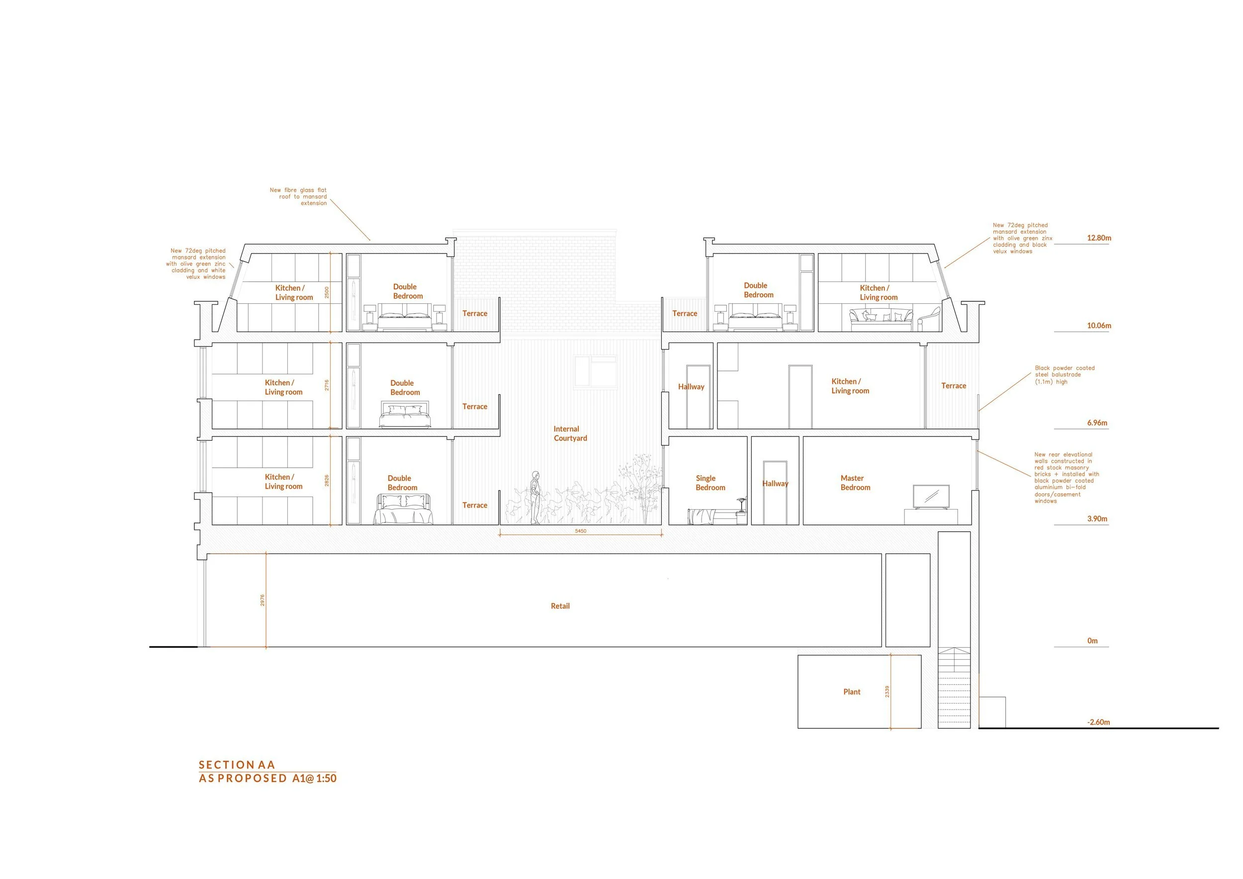 The project is a C-shaped plan allowing for a central first-floor communal courtyard with 6 residential flats split to the front and rear. The rooftop extension is covered with olive green zinc clad and is matched with the window aprons in the front keeping in line with its immediate context.